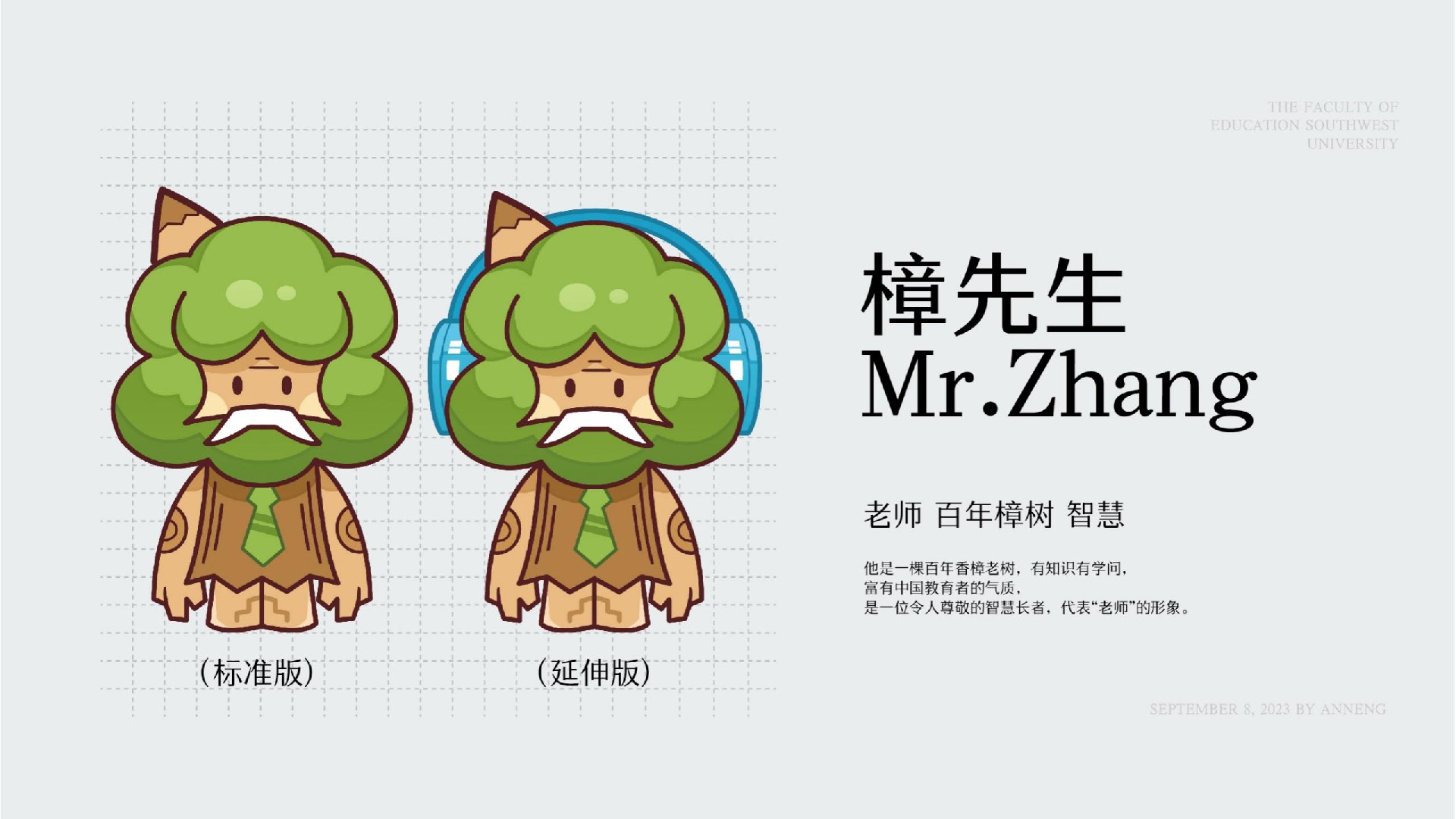 樟先生以一棵百年香樟老树为原型,化身知识与智慧的象征。他形象独特,头顶茂密的绿色树冠,宛如一头蓬松的卷发,脸上留着白色的胡须,身着棕色带有纹路的服饰,系着绿色领带,尽显稳重与儒雅。樟先生富有中国教育者的气质,有知识有学问,是令人尊敬的智慧长者,代表着 “老师” 这一神圣的形象。延伸版的樟先生还佩戴着耳机,增添了几分现代感与时尚气息,仿佛在时刻聆听知识的声音,也寓意着与时俱进,不断学习。